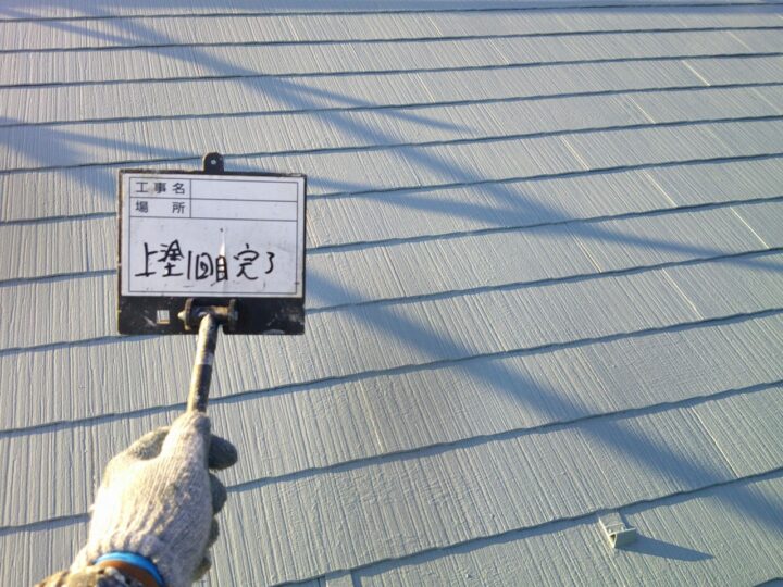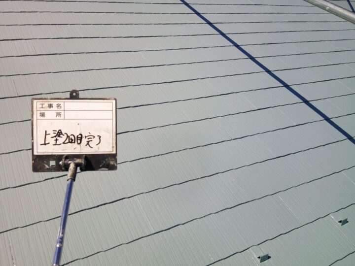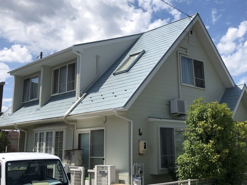 屋根はスレート屋根のため、下地の状態を確認しながら丁寧に洗浄と下地調整を行いました。屋根塗装には高耐久フッ素塗料「セミフロンルーフⅡ」を使用しています。フッ素樹脂塗料は耐候性・耐紫外線性に優れており、松本市の厳しい自然環境でも長期的に屋根を保護することができます。特に松本市は紫外線量が多く、屋根の劣化が進みやすいため、高耐久塗料による屋根塗装は非常に効果的です。