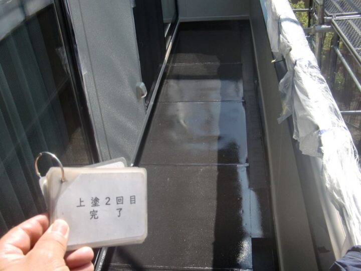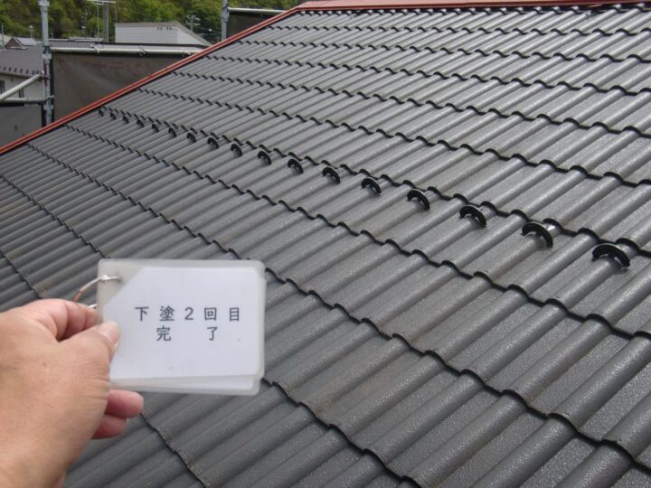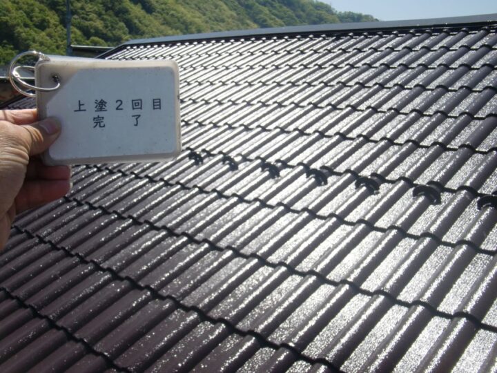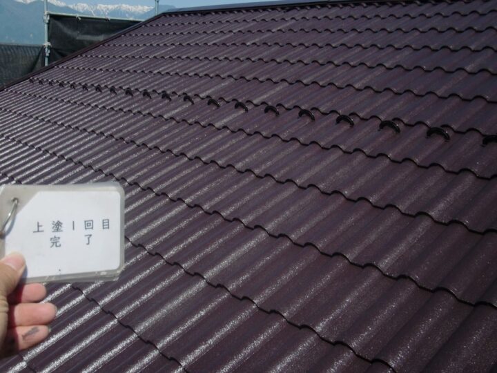 屋根はセメント瓦で、デザイン性に優れる一方、防水性を維持するためには定期的な塗装メンテナンスが不可欠です。セメント瓦は塗膜が劣化すると吸水しやすくなり、安曇野市の冬季には凍害によるひび割れや劣化の原因となります。そのため安曇野市での外壁塗装と同時に、屋根にも高耐候・高耐水性の塗料を選定することが重要です。今回使用した「スーパーフッソルーフペイント」は、フッ素樹脂ならではの優れた耐候性と低汚染性を兼ね備え、長期間にわたり屋根を保護します。安曇野市の厳しい自然環境にも対応できる仕様となっています。