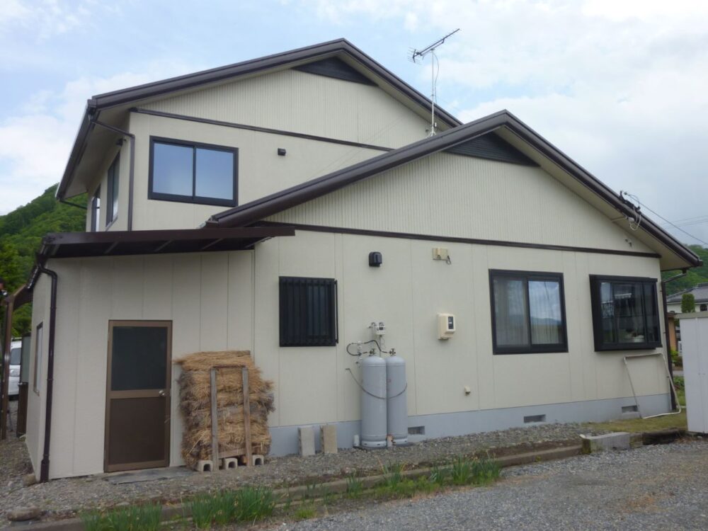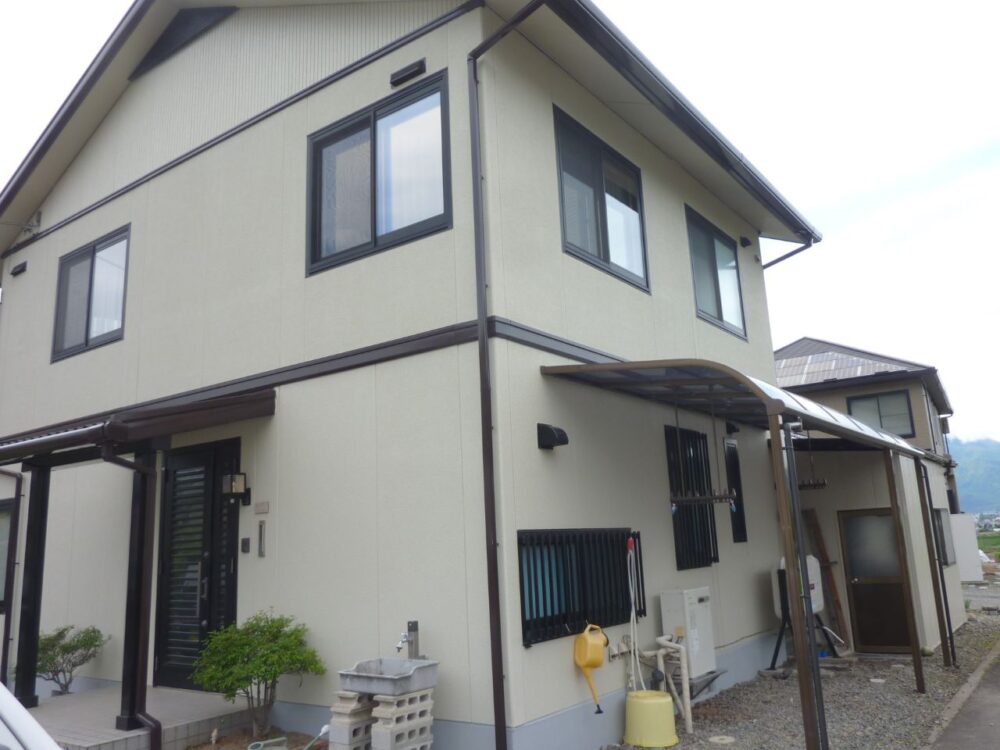 施工は2023年5月に実施し、約1か月間で完工しました。安曇野市での外壁塗装では、春先は気温や湿度が安定しやすく、塗装に適した時期ではありますが、日中と朝晩の気温差には注意が必要です。塗料の乾燥条件を見極めながら工程を進めることで、外壁塗装の性能を最大限に引き出しました。下地処理から仕上げまで細部にわたり丁寧に施工することで、耐久性の高い仕上がりを実現しています。